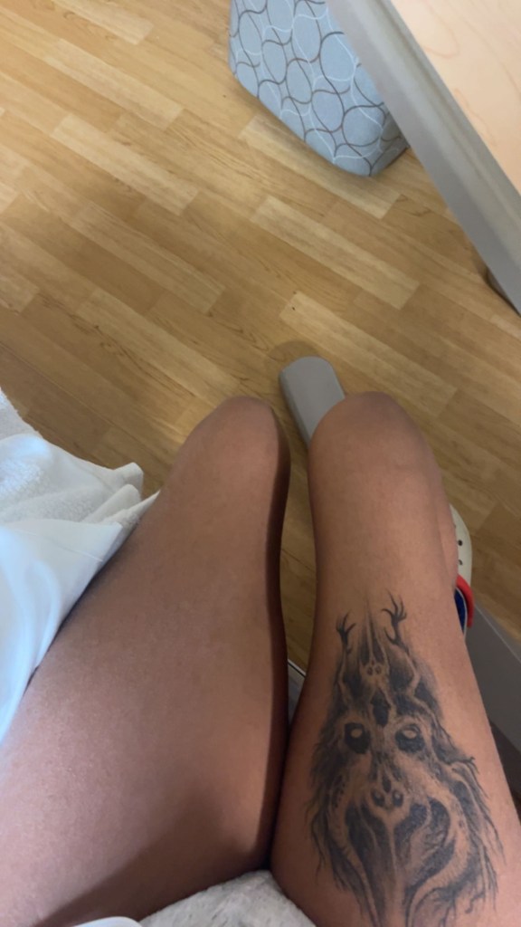 ( Left leg is sitting, right is when raised up, ignore my old lady depends, they were my go to outfit in the hospital )